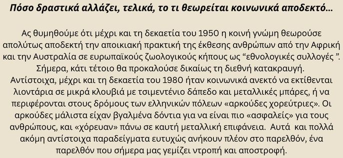 Ζούμε μια εποχή όπου επιδιώκουμε να αναθεωρήσουμε τους ηθικούς κανόνες και το νομικό πλαίσιο ώστε να προστατεύουμε καλύτερα τα ζώα και να τερματίζουμε πρακτικές κακοποίησης και εκμετάλλευσης, έστω και με καθυστέρηση δεκαετιών. Γιατί όμως είναι ακόμα αποδεκτό να βασανίζονται θαλάσσια θηλαστικά σε τσιμεντένιες δεξαμενές, σε χώρους που επισκέπτονται χιλιάδες άνθρωποι και κυρίως μαθητές σχολείων και οικογένειες με μικρά παιδιά, με οικονομικό αντίτιμο;