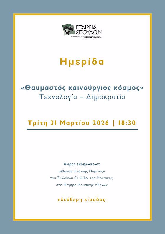 Η Εταιρεία Σπουδών Ν.Π. & Γ.Π. (ιδρυτής Σχολή Μωραΐτη) σας προσκαλεί στην εκδήλωση που διοργανώνει με τίτλο «“Θαυμαστός καινούργιος κόσμος”. Τεχνολογία - Δημοκρατία», την Τρίτη 31 Μαρτίου 2026 και ώρα 18:30, στην αίθουσα «Γιάννης Μαρίνος» του Συλλόγου Οι Φίλοι της Μουσικής στο Μέγαρο Μουσικής Αθηνών.